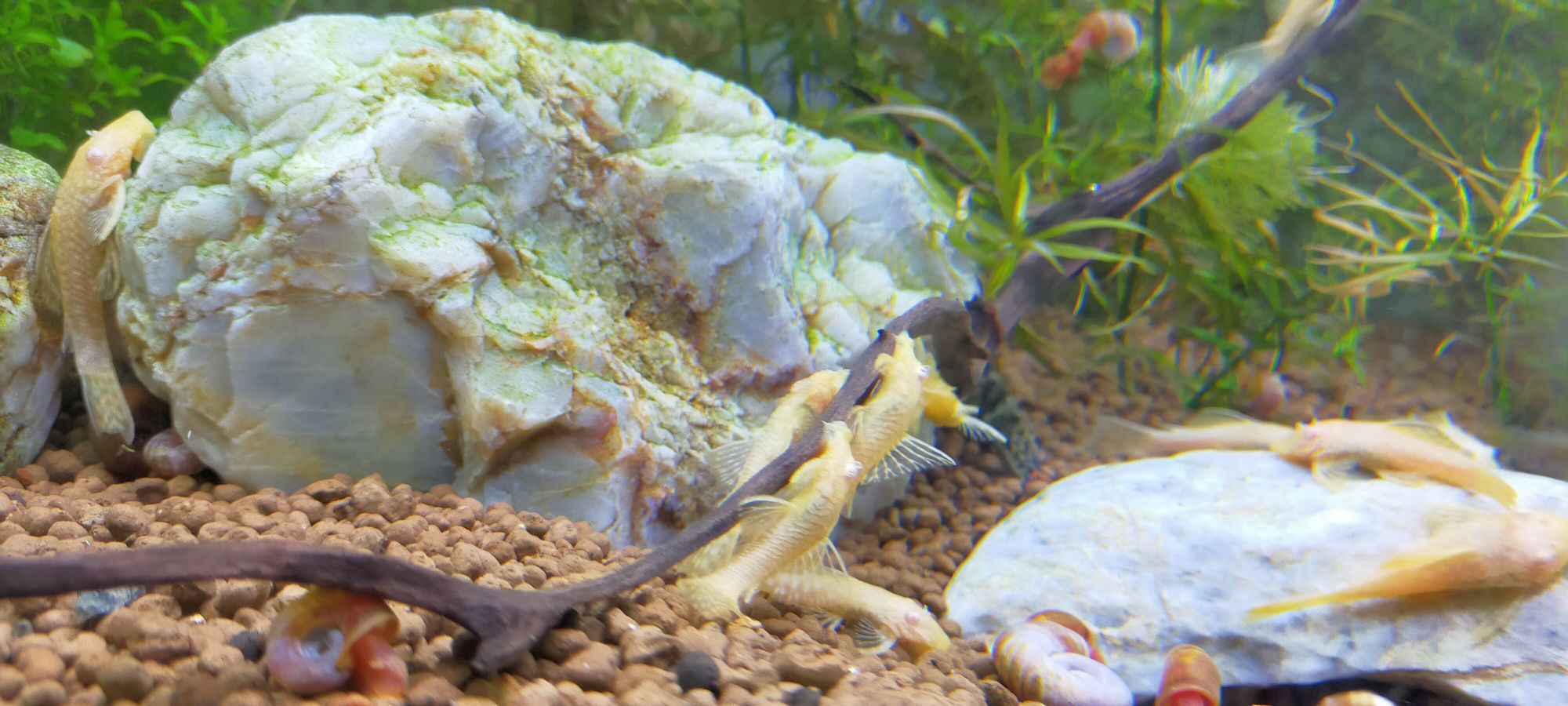 水槽の壁面や流木の表面、アヌビスの葉っぱなど「コケが生えやすい場所」を舐めるようにキレイにしてくれます。