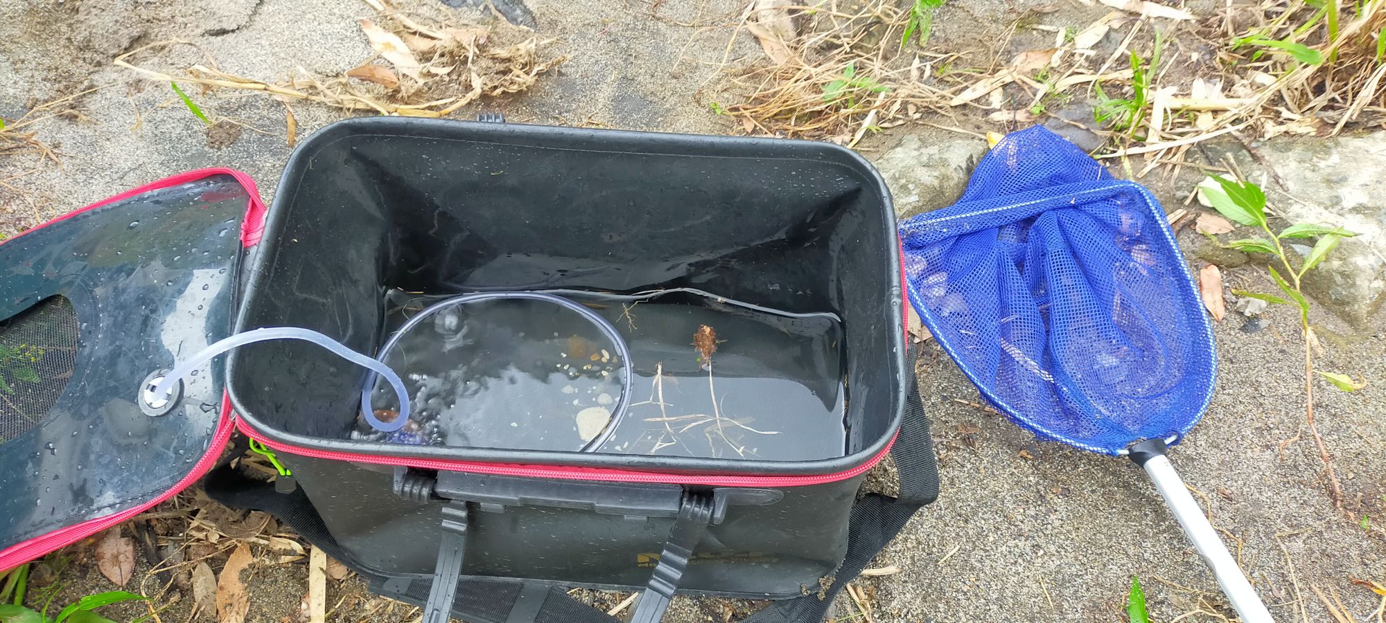 持ち帰りは、バケツなどに川の水を入れて、携帯エアポンプをかけて持ち帰るのが1番簡単です。