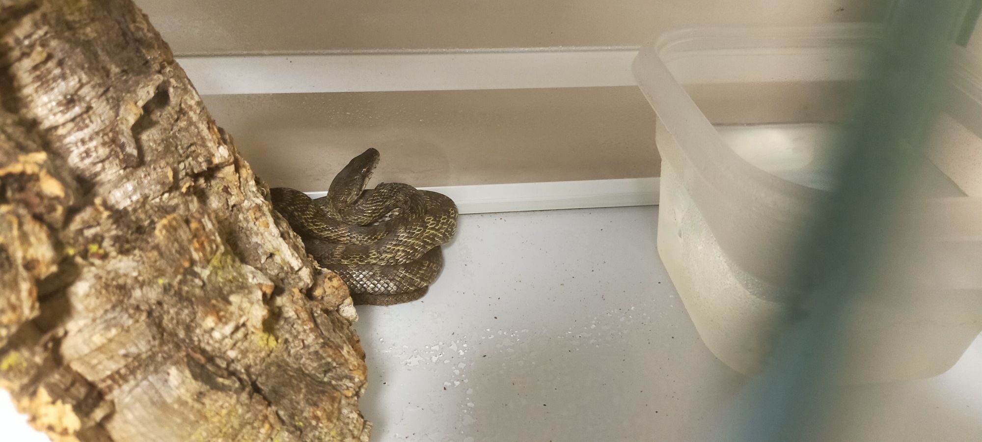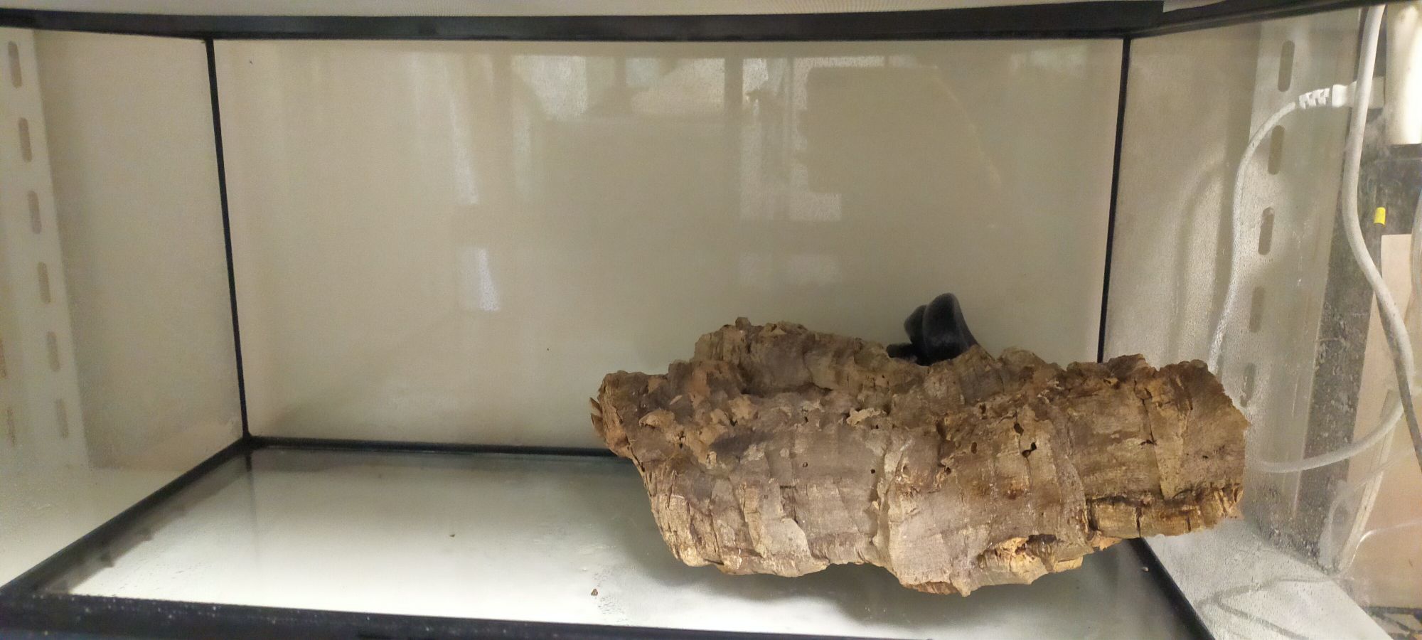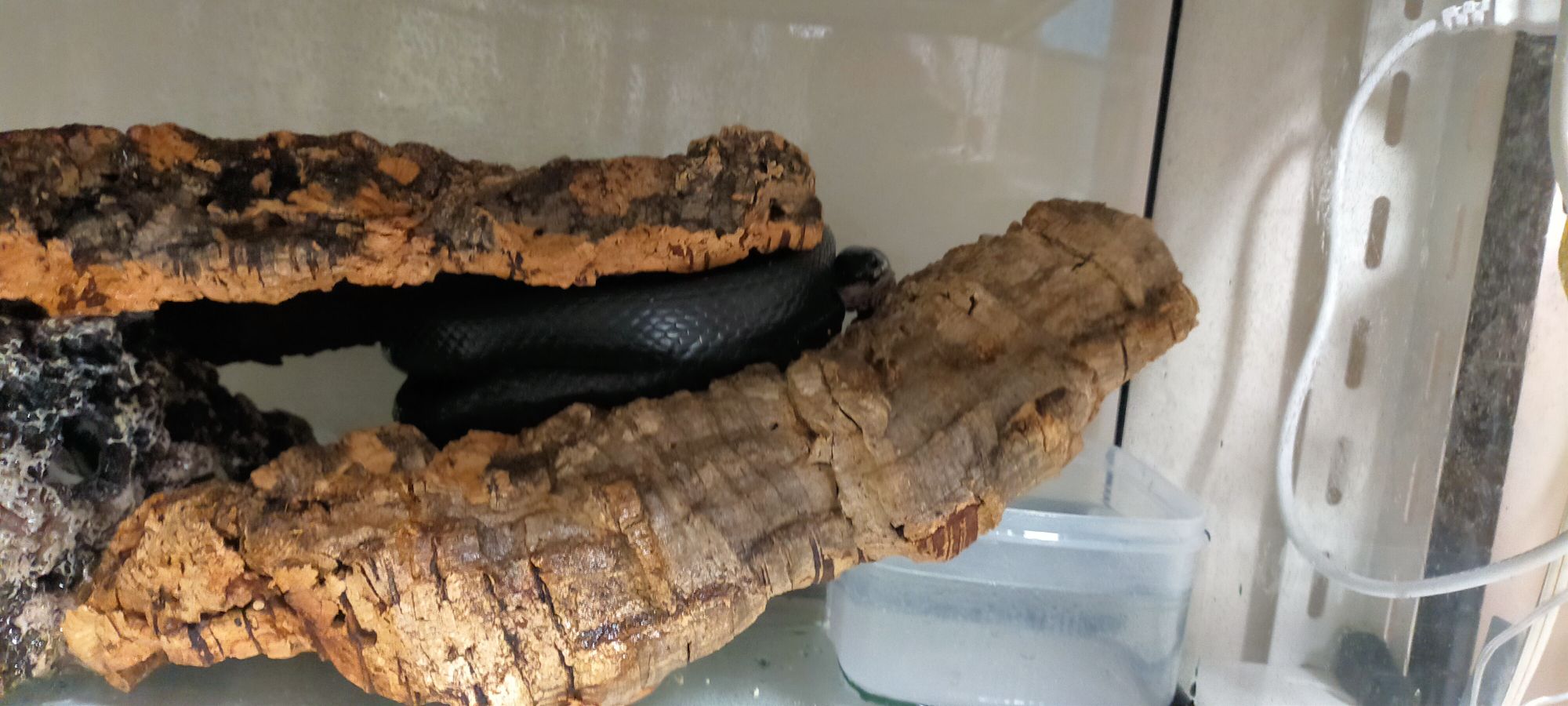 60センチ×45センチの飼育ケースでカラスヘビちゃんは飼育していますが……ビビると↓のように隠れて、「コルク樹皮を飼育しているようなケージ」になってしまいます。