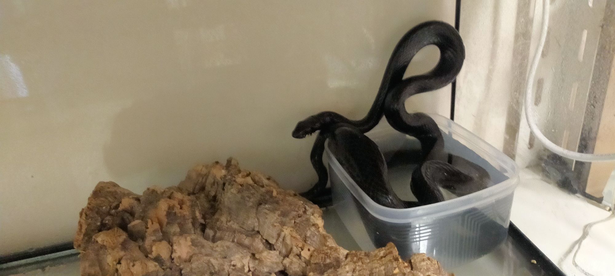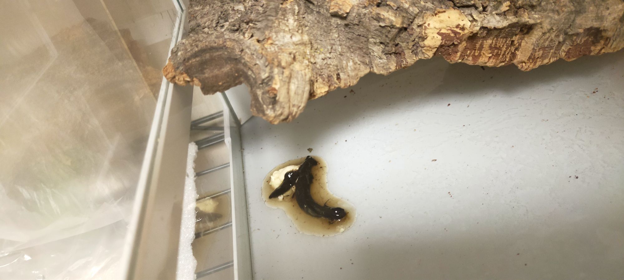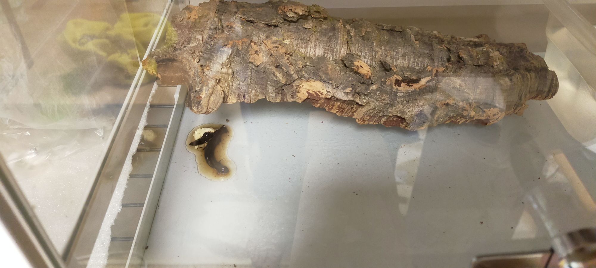 60センチ×45センチの飼育ケースでカラスヘビちゃんは飼育していますが……ビビると↓のように隠れて、「コルク樹皮を飼育しているようなケージ」になってしまいます。