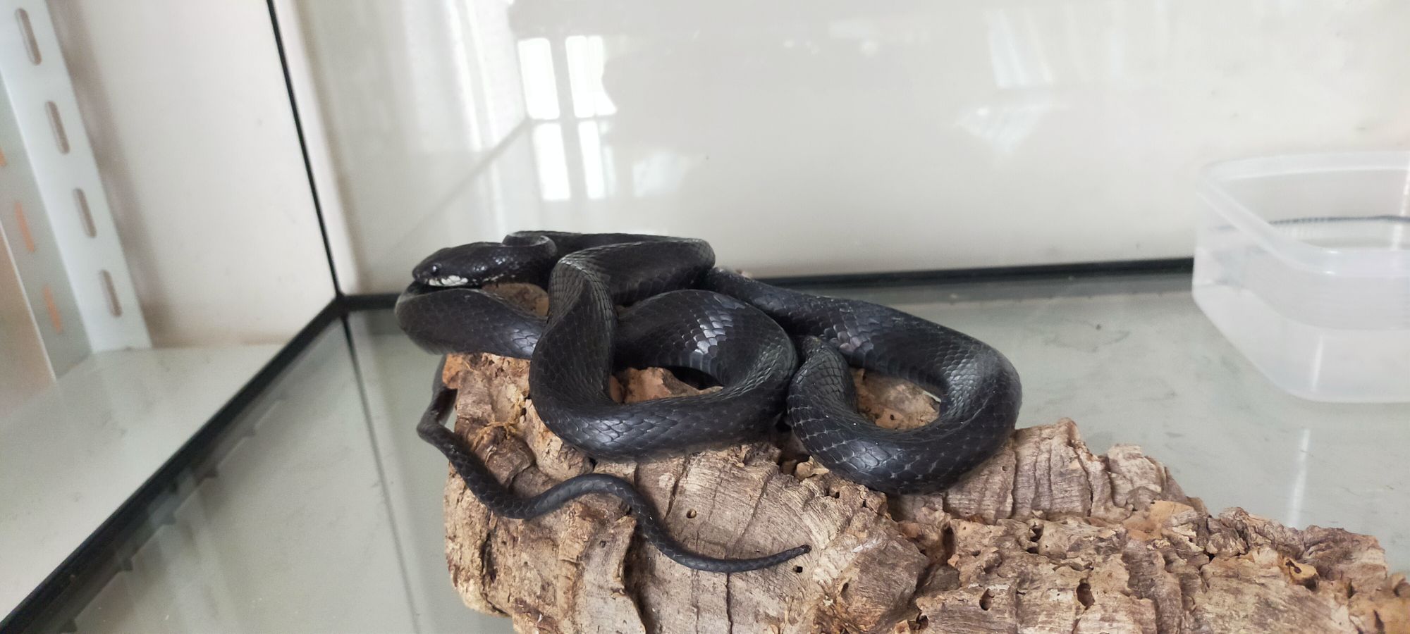 カラスヘビちゃんがゆったりしている時は、↓のようにコルク樹皮の上にいたり、デローンと伸びていたりと格好いい姿も見れます。