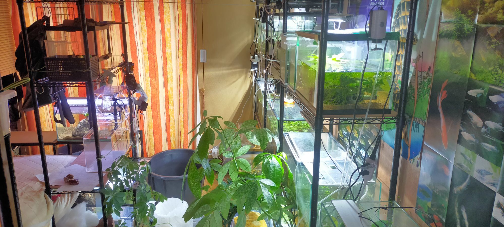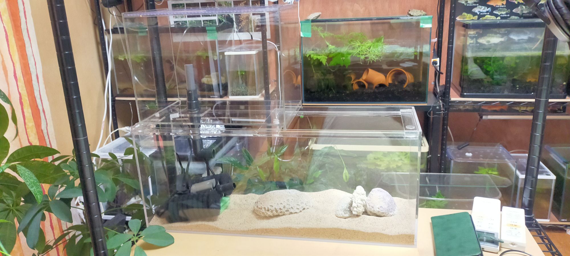 ……ということで↓のように、水槽部屋(兼私が事務所に泊まるときの寝室)には、水槽や飼育ケースが30個くらい置いてありますけれど、不安を感じることは今のところありません。