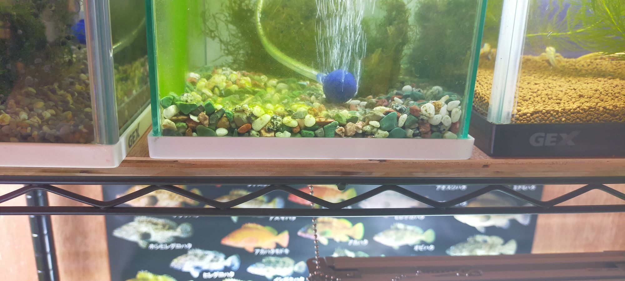 メタルラックの上の方は水槽を満水にせずに半分くらいの水量にしたり、メタルラックのたわみを計算して水槽の下に板を敷いたり……という破損を防ぐ工夫もしています。