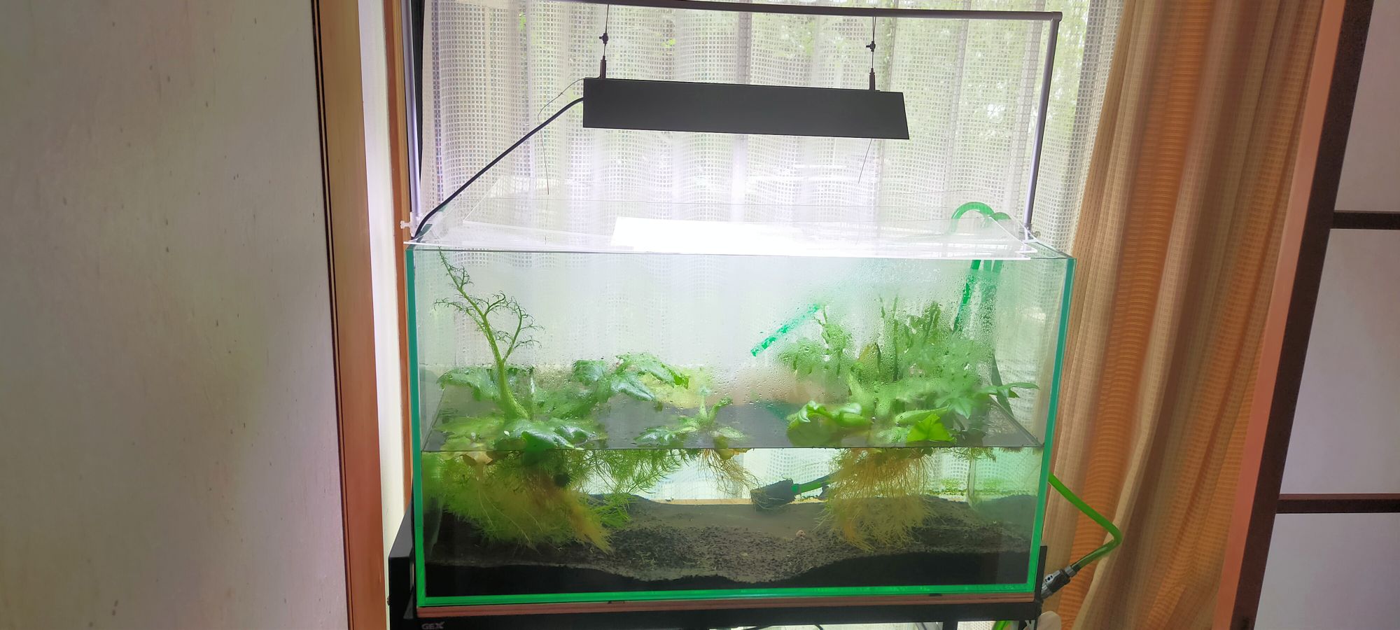 湿気とカビ対策は、私の場合は「エアコンの除湿を上手に使う=ちょっと低めの温度にすると除湿が効きやすいので、毎日1時間ぐらい湿度対策で除湿をかける」+「扇風機で部屋の空気を循環させる=カビの発生の予防」+「人が生活したり、出入りする部屋に水槽を置く=自然と換気されて空気が淀まないので、カビや湿気対策になる」ーーという感じで悩まされなくなりました。