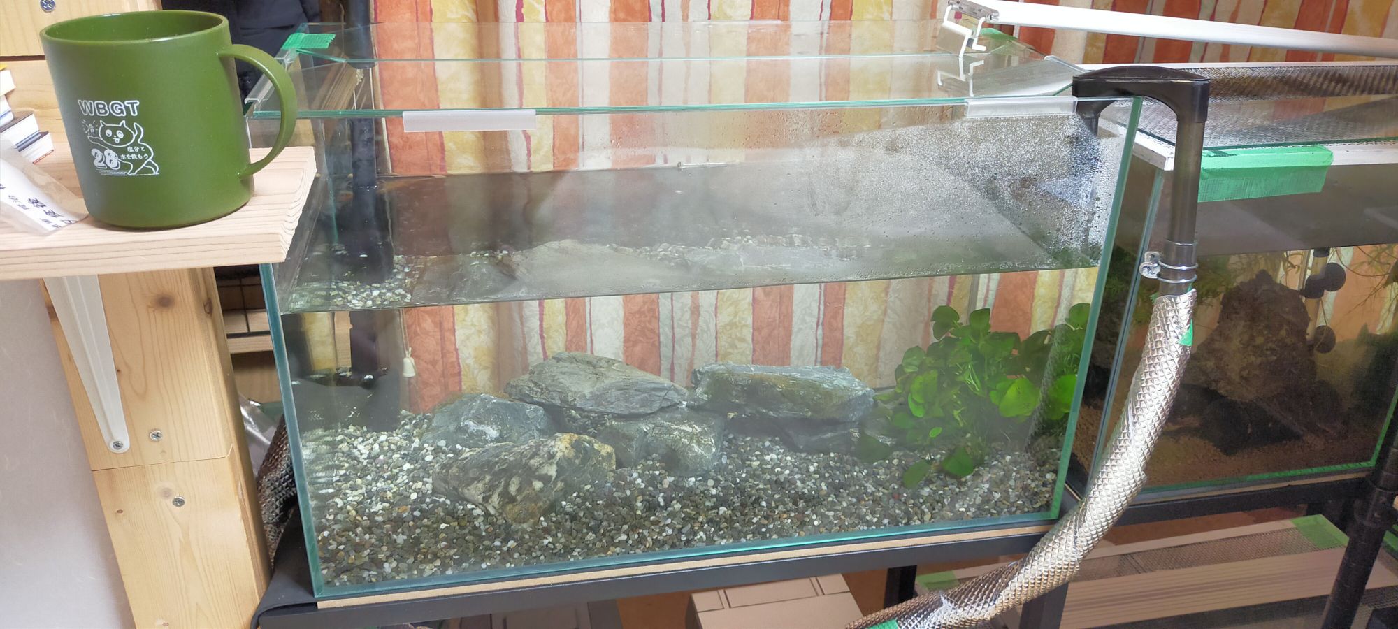 ひとまず、↓のように水槽をセットできましたので来週辺り(禁漁期にならないうちの9月中に)ヤマメを釣って来ようと思います。