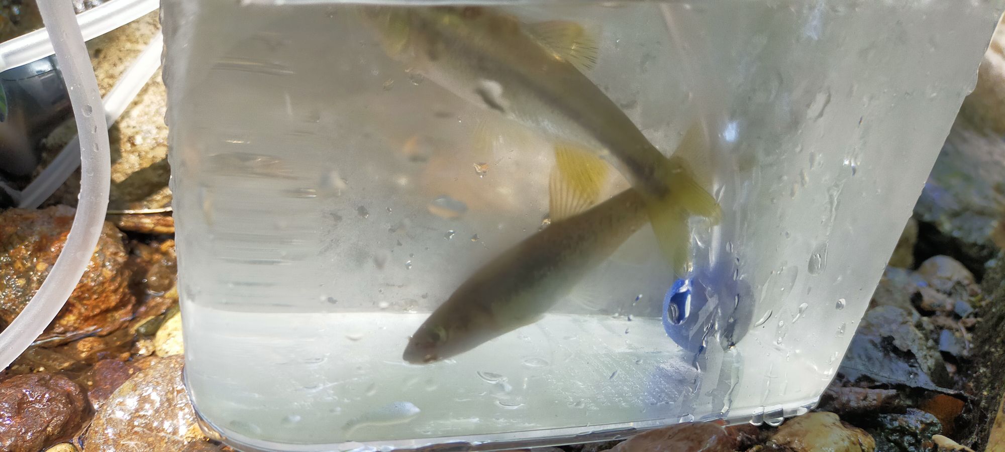 また、ヤマメ単体で飼育するとなかなか餌を喰わないらしいのでーー水槽でも餌を食べてくれやすい「タカハヤ」を事前に釣ってきて、水槽に入れておくようにします。