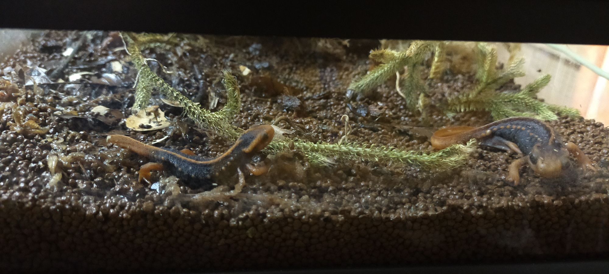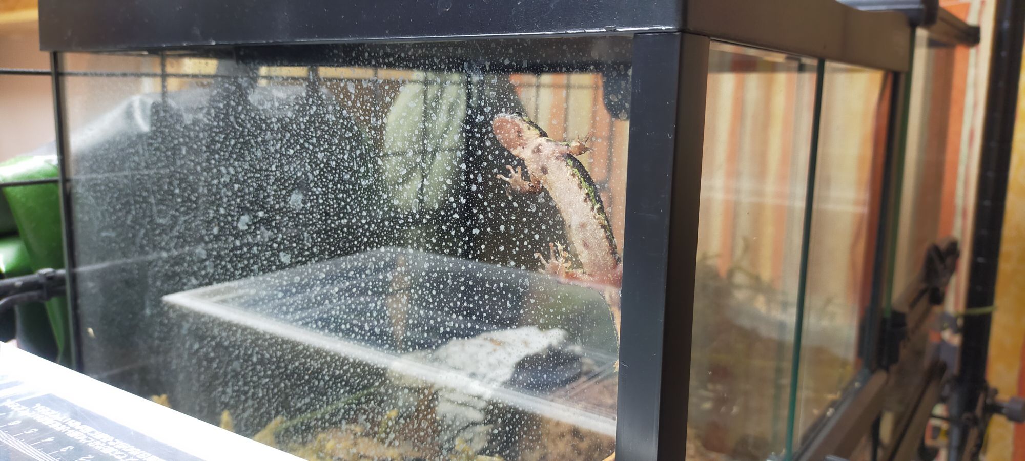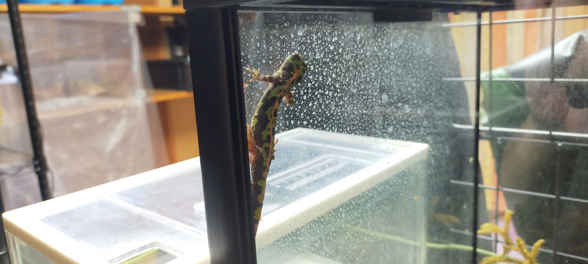 なお、先日は↓のように、マダライモリが飼育ケージの壁を登っていました(笑)