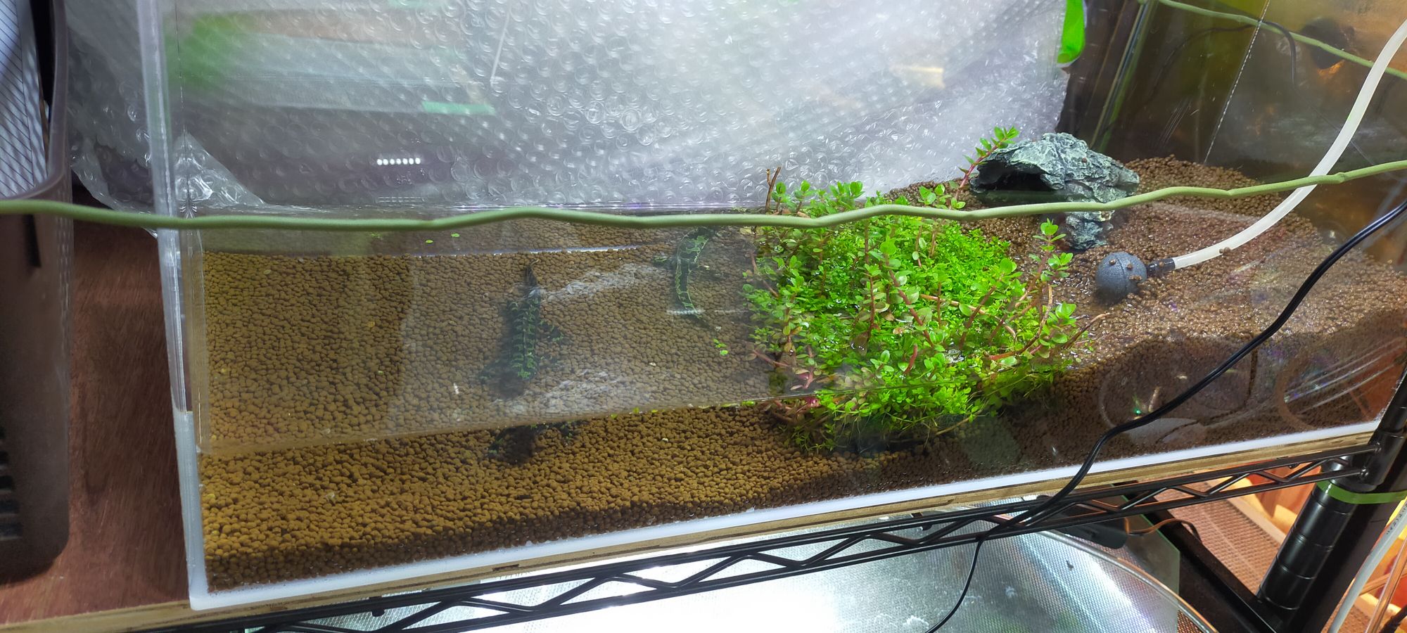 2023年と2024年産まれのマダライモリを1ペアずつ4匹、相性や喧嘩していないか様子を見ながら飼育してーー水場の有るケージに移行しました。