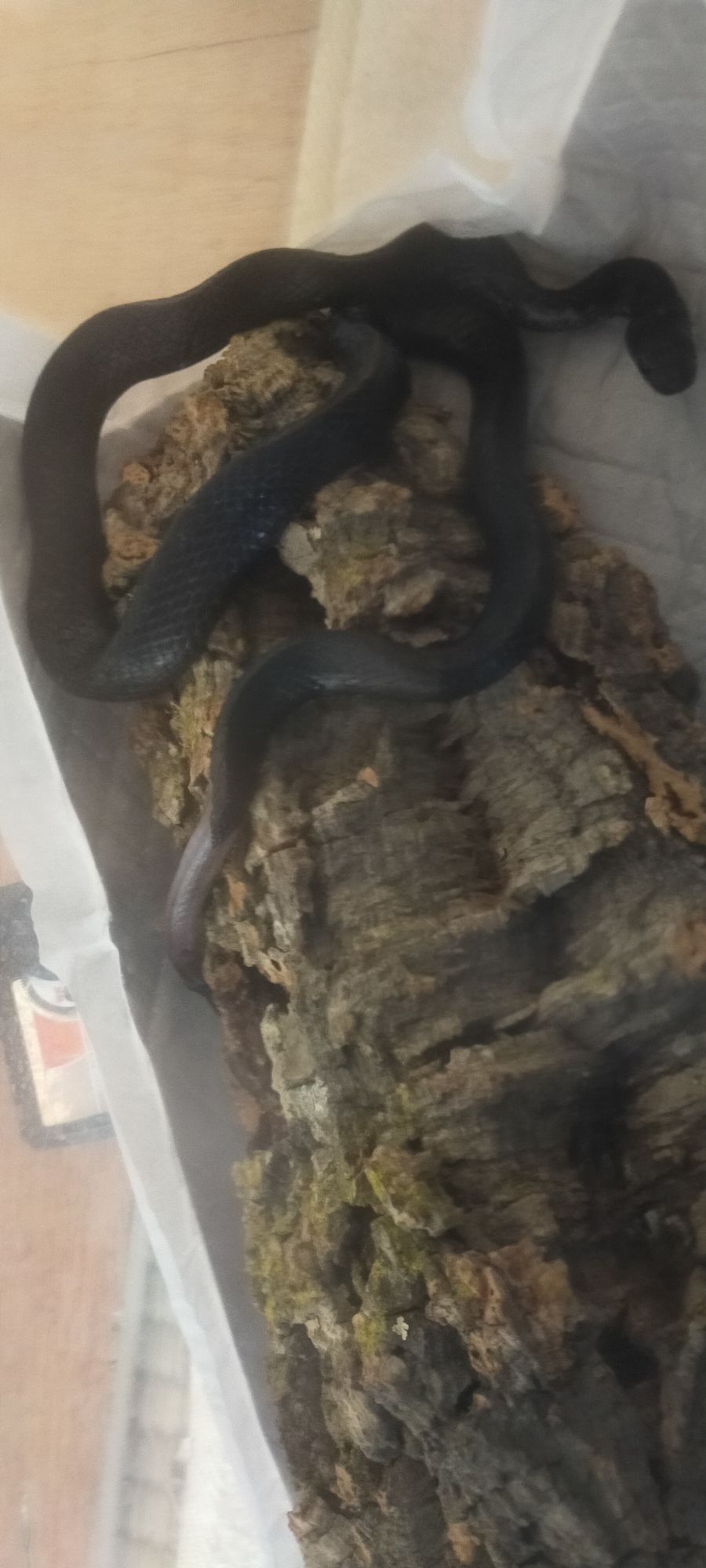 入れた日は↑のように動かずにとぐろを巻いて固まっていましたがーー一晩経つと↓のように、ちょっと動けるようになっていました。