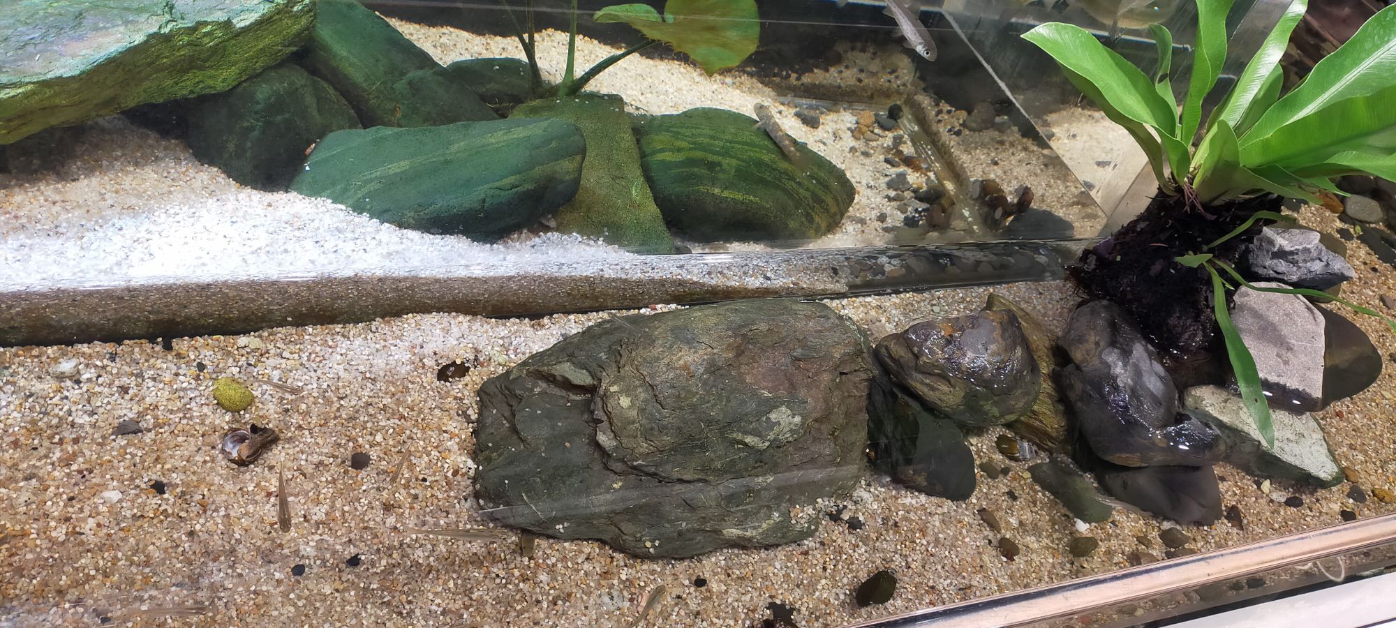 珪砂と岩石で清流の石組みをつくり、石の下にうなぎも居たりします♪ ちなみに、こちらの子は冷凍赤虫を食べているとのこと。