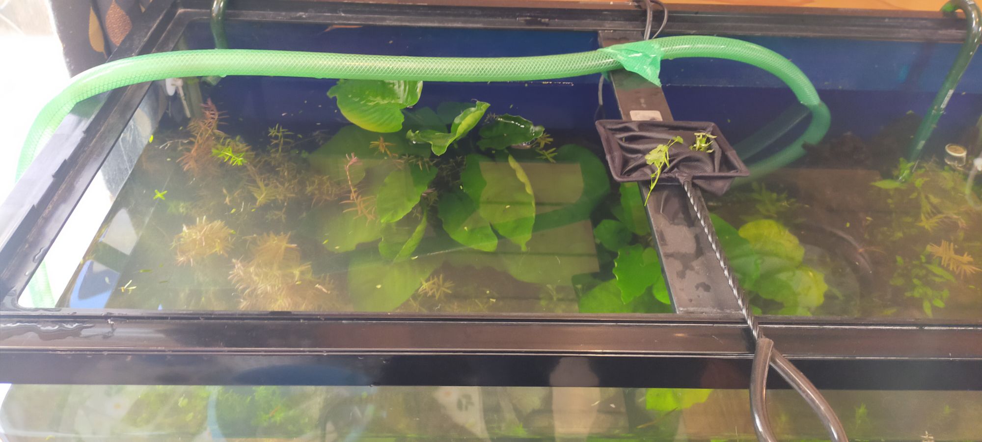 水槽の前部分の水草を全部抜いてーー底砂クリーナーをかけて、溶けたソイルやヘドロをしっかり掃除してーー水草を植えなおし(株の切り戻しによる更新)をしていきます。