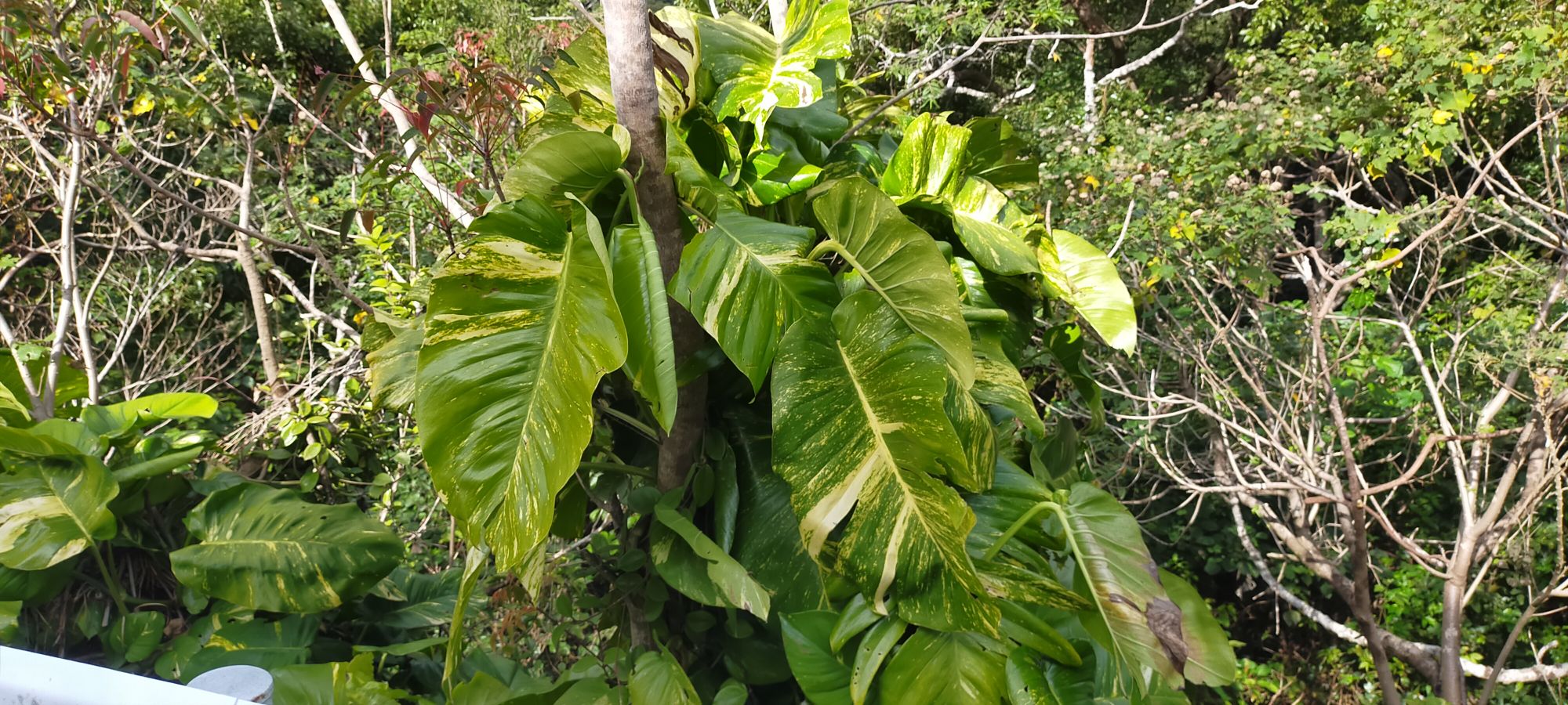 ↓はオウゴンカズラ(野生化したポトス)。園芸店でよく見かけるポトスも、野生化したら「大人の顔以上のサイズの葉っぱ」になります。