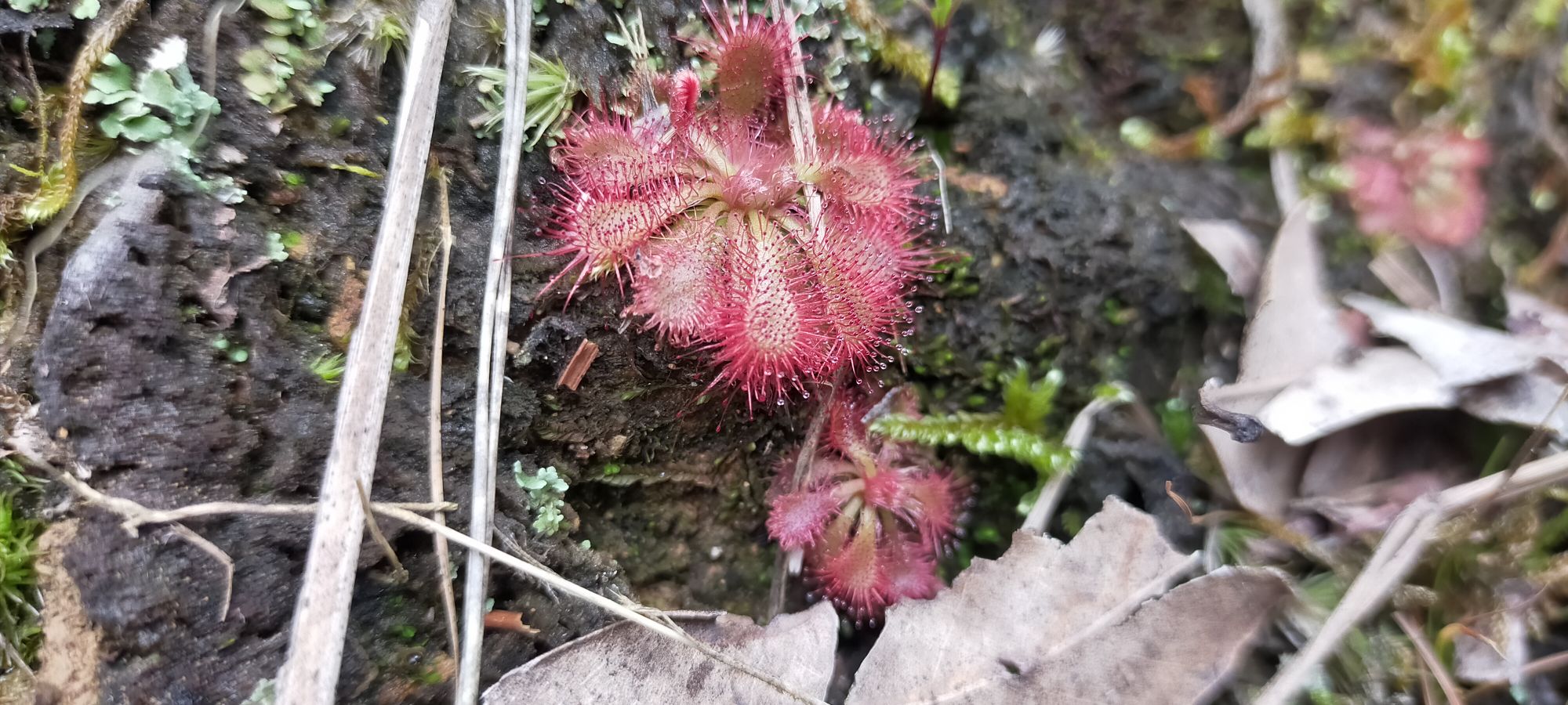 その後、場所を変えてーーモウセンゴケの観察。結構、直射日光ガンガン当たる場所に生えています。