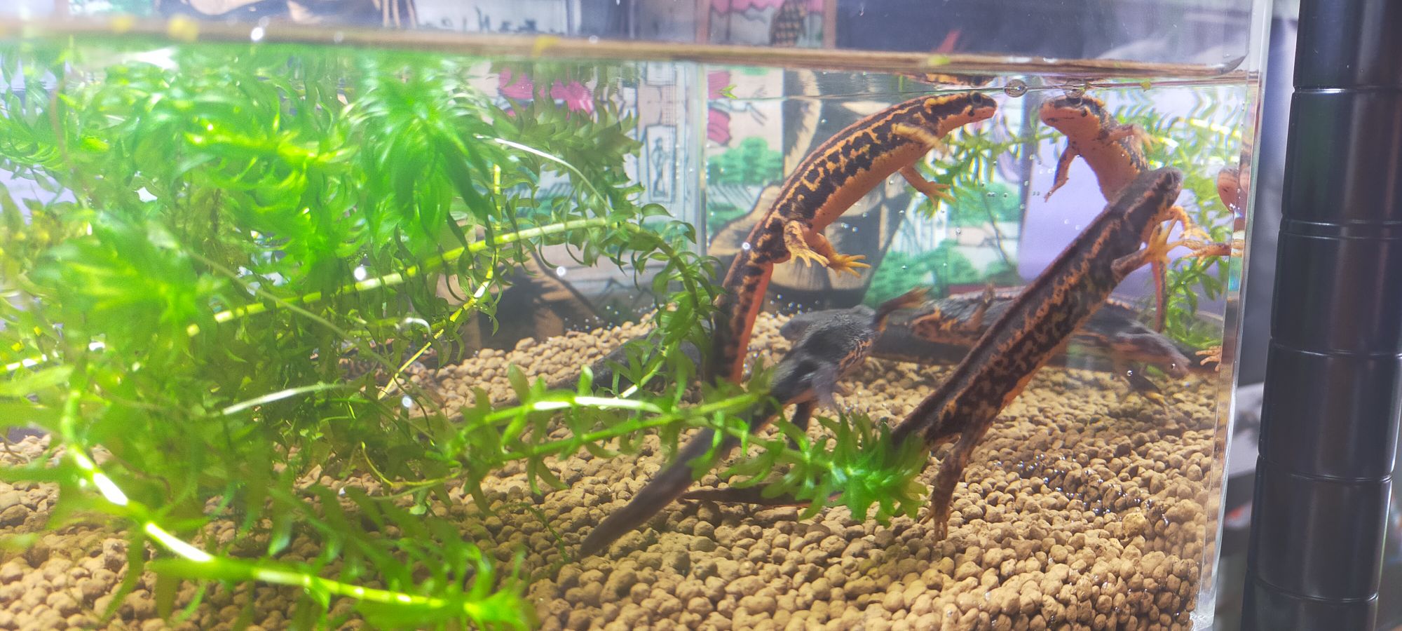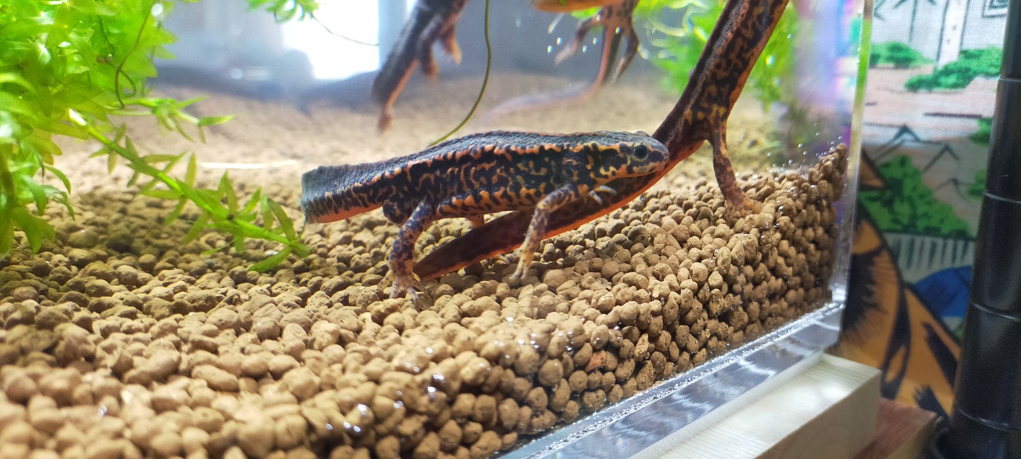 フランジで脱走防止&蓋で二重に脱走防止ーーという風に考えています。綺麗な柄のイモリに限って、アクティブに脱走しようとするので……オーダーメイドのイモリ専用水槽にすることで「安心を買えた」と感じます♪